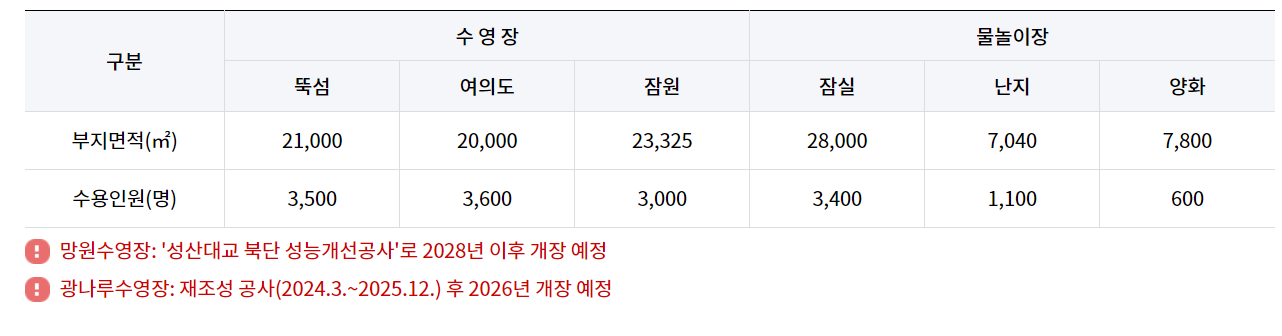 운영장소 : 뚝섬수영장, 여의도 수영장, 잠원 수영장, 잠실물놀이장, 난지 물놀이장, 양화물놀이장
